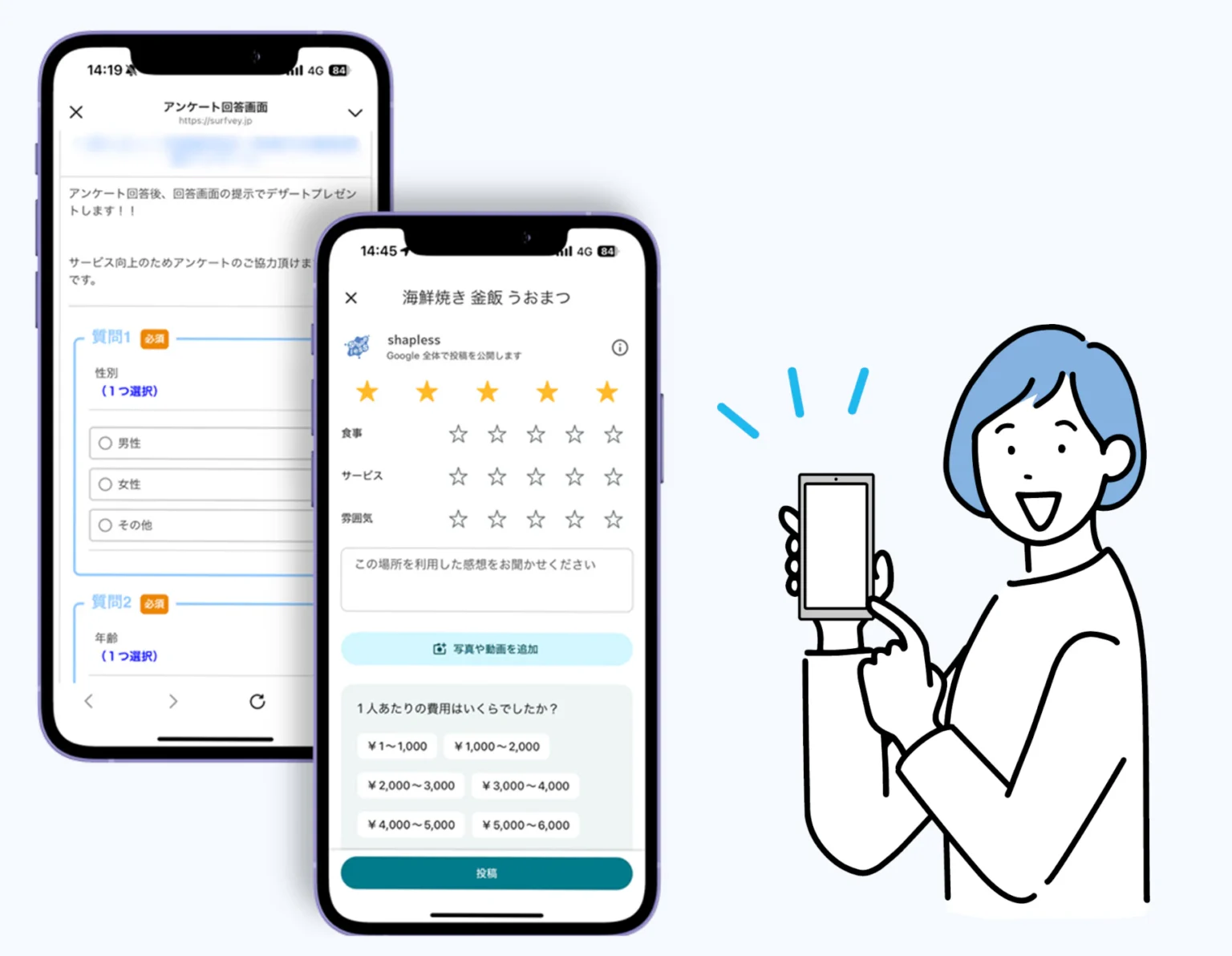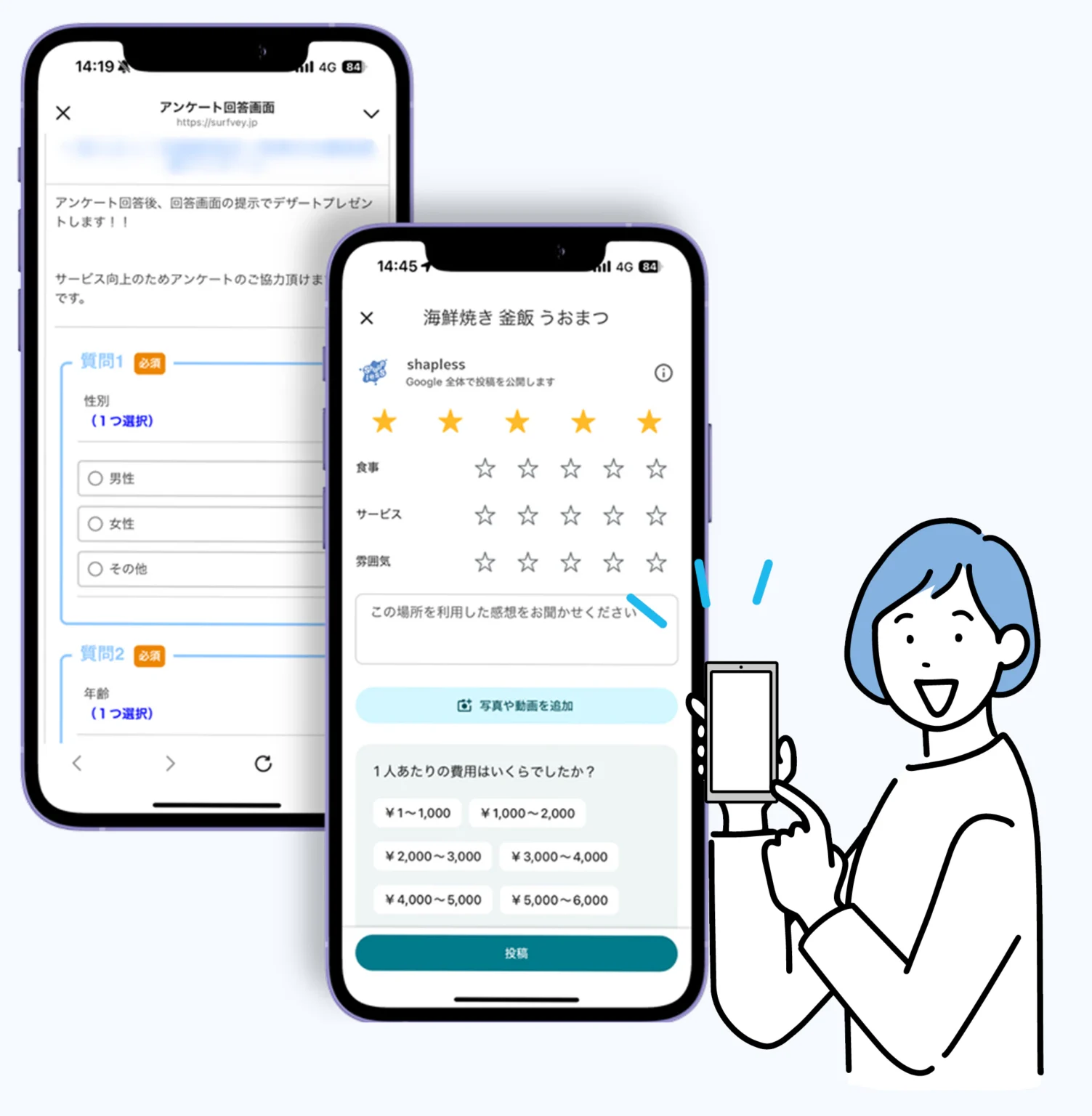 アンケートと Googleクチコミで 評価グングンUP! はアンケートとクチコミ依頼を 同時に実現できるツールです お申込みはこちら 資料請求はこちら ABOUT Surfveyについて クチコミ×アンケートで集客を加速 「クチコミをお願いしにくい」 「紙アンケートの集計が大変」…そんな課題を解決! Surfveyなら、アンケートとクチコミ依頼を ひとつの流れでかんたんに。 高評価のクチコミ が自然に増えて、 集客力アップ につながります! CASE ケース このようなお悩みありませんか? 紙アンケートは集客に手間がかかる クチコミ依頼は現場スタッフにとって声をかけにくい アンケートとクチコミの工程が分かれると、お客様の負担が増えて依頼しづらい 低評価のクチコミが入るリスクがあり、見極めが難しい 店舗にとって 時間 人手 集客 の 損失 も考えられます FEATURE 特長 Surfveyなら、かんたん3ステップでアンケートとクチコミ依頼をまとめて完了できます。 STEP01 案内 店内に掲示しているQRコードを読み取りまたはLINEやメールでURLを送る STEP02 回答 店舗のアンケートに答える基本選択式のアンケートなので手間なくさくっと回答 STEP03 高評価のみGoogleのクチコミへ遷移 低評価のユーザーはSTEP02で終了! STEP02で高評価のユーザーのみGoogleのクチコミページへ遷移します。 Surfvey導入のメリット3選 01 店舗様の負担軽減 依頼・集計・クチコミ投稿の手間を最小化!スタッフの工数削減で接客に集中できます。 02 集客強化 高評価顧客のみGoogleクチコミへ誘導。また、AIがクチコミ文を生成してくれるので投稿ハードルを下げることができます。 03 業務の改善効果 顧客の声を効率的に集めてデータ化!低評価は外部に出さず内部データとして蓄積できます。 誰でもかんたん回答までの流れ STEP01 アンケート読み取り QRコードの読み取り またはURLをタップします STEP02 言語選択 言語を選択します。日本語の他に英語、中国語、韓国語に対応しています。 STEP03 アンケート回答開始 アンケートに回答します(任意項目は設定できます) STEP04 アンケートを回答する ボタンクリックで回答完了! STEP05 クーポン&投稿文AI生成 アンケートの回答を元にクチコミ投稿文が自動作成! STEP06 Googleへ遷移 Googleへクチコミ投稿ができます! 投稿文は前ページで自動コピーされるためユーザーは貼り付けるだけでOK! REASON 選ばれる理由 Surfveyはプログラミング知識がなくても直感的に使えるアンケート作成ツールです。 誰でもかんたんにアンケートを作成でき、回答データは自動で集計&出力! はじめての方でも「使ってすぐわかる」やさしい設計です。 POINT01 かんたんアンケート作成 管理画面から誰でも数分で作成できます。 POINT02 自動で多言語表示ができる 日本語で作成したアンケートは英語・中国語・韓国語などに自動翻訳されます。 POINT03 高評価だけを誘導 満足度が高いお客様だけをGoogleクチコミへ誘導し、リスクを回避できます。 POINT04 AIがクチコミ文を提案 アンケートの回答内容からGoogleのクチコミ文を自動生成します。投稿のハードルを大幅に減少します! POINT05 集計データの出力 レポートですぐに分析がです。ワンクリックでかんたんにデータ化!改善に直結します。 POINT06 集客と改善の好循環 良いクチコミが増え、サービス改善にもつながる好サイクルを実現します。 PRICE ご利用料金 初期費用・導入費用なし ご利用料金 [1アンケート基本料金] ¥5,500 FREE SERVICE 初期費用なし 契約期間なし クチコミPOP作成 POPデータ付き! 今ならなんと 1ヵ月無料 トライアル付き POPデザインも充実 7種類のデザインからお好きな用途に合わせてお選びいただけます。作成は20枚まで無料!A5サイズまたははがきサイズから。 CASE STUDY 導入実績 システムを導入した店舗様の事例 導入前 導入後 システム導入後、9ヶ月でGoogleのクチコミ件数が300件以上アップ!アンケートとクチコミ依頼をひとつの流れでかんたんにすることで、高評価のクチコミが自然に集まります。 まずは無料でお試しください 1ヶ月間、すべての機能を無料で体験できます。契約の縛りは一切ございません。 お申込みはこちら 資料請求はこちら